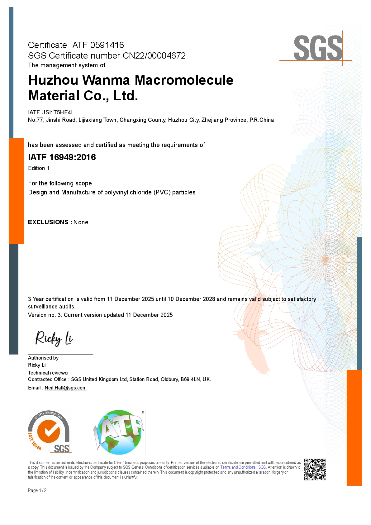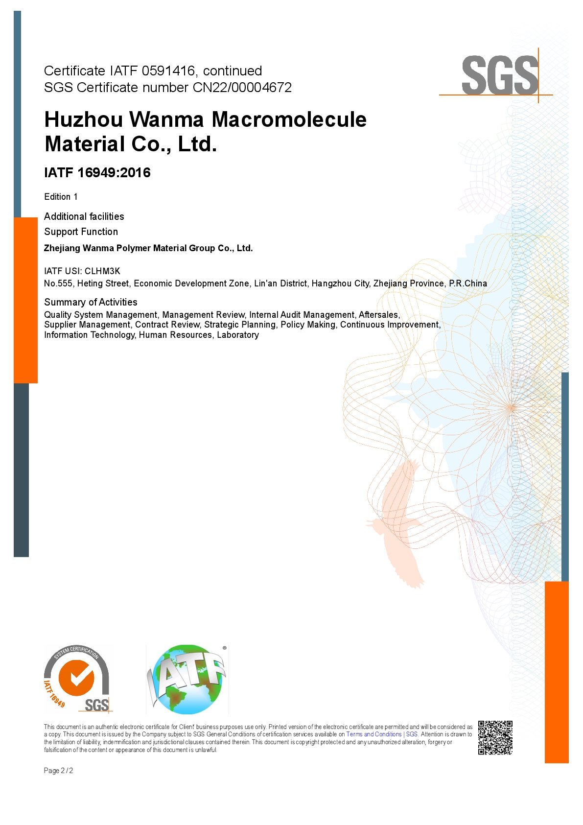 Wanma Macromolecule has always attached importance to quality management. The company has obtained IATF16949 certificate, ISO9001 quality management system certificate, ISO14001 environment management system certificate and ISO45001 health and safety management system certificate etc.